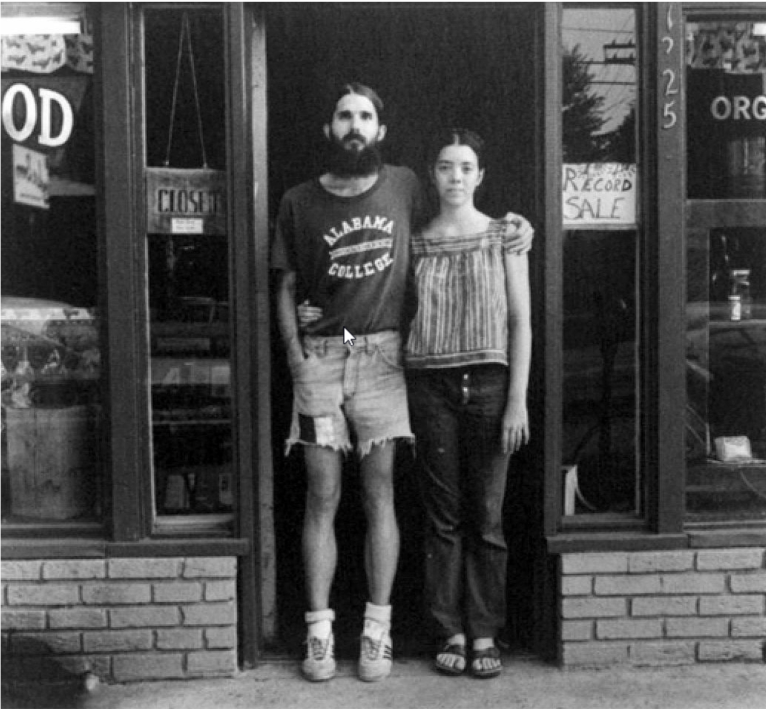 Circa 1972, Earle and Frances in the doorway of Harmony Natural Foods